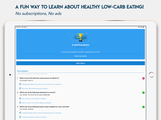 The quiz contains thousands of questions from various categories & difficulty levels. Each game you play consists of 15 random questions of increasing difficulty levels. At the end of each game you can see a summary of your answers and relevant online resources for each quiz question. You can share your score with your friends and challenge them to take the keto diet quiz.