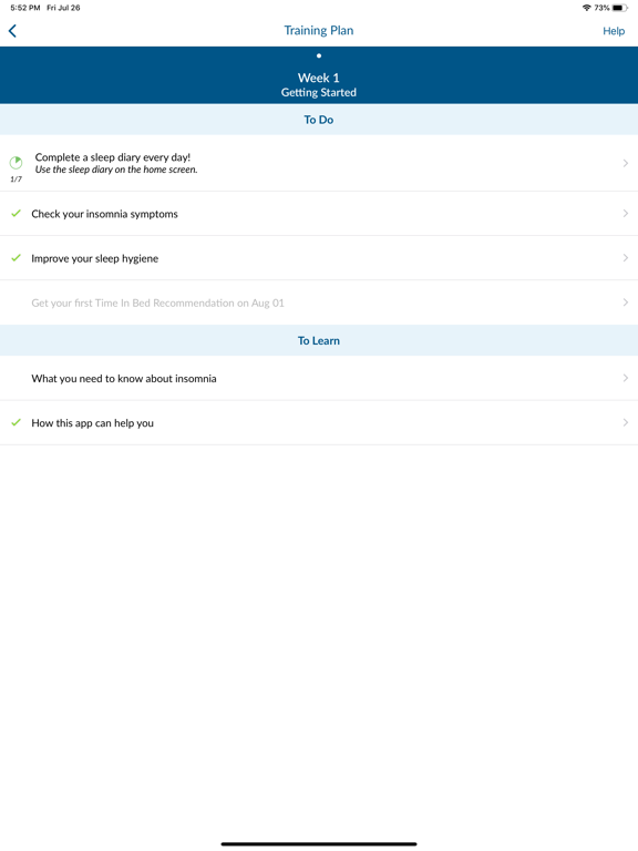 Insomnia Coach is designed to be used daily for 5 weeks by following the Training Plan. After that, you can continue using the app to track your sleep and maintain good sleep habits.