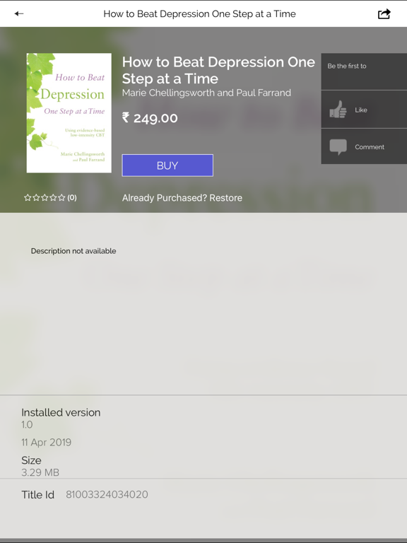 Overcoming Depression gives you the support you need to see your way through depression and low mood. Self-assessment scales help you to determine if you have a problem with depression. Simple tools help you take control of your own recovery programme using cognitive behavioural therapy (CBT). An online catalogue offers recommended reading for depression and these books can be purchased as e-books for use within the app’s built-in e-reader.