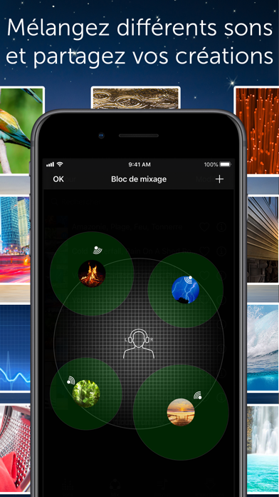 • Création de nouveaux sons en mélangeant plusieurs bruits comme un DJ avec le support de l’ajustement du volume, de la balance, et du pitch de chaque son individuellement dans le mélange