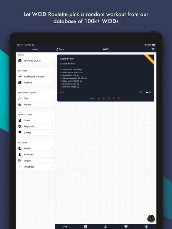 WOD Roulette serves you a random WOD from our collection, ranging from classic benchmark WODs and Open workouts, to new, cool metcons you have never done before. Simply click the roulette button or shake your phone (to warm up you wrists and shoulder ;) ) and you have yourself a workout! As simple as that!
