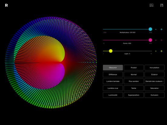 Créé de magnifiques images basées sur les tables de multiplication. Vous pouvez les animer. Des interactions sont possibles en modifiant le nombre de points, le facteur de multiplication, le mode de couleur et l'épaisseur des lignes. Partager vos créations avec les autres.