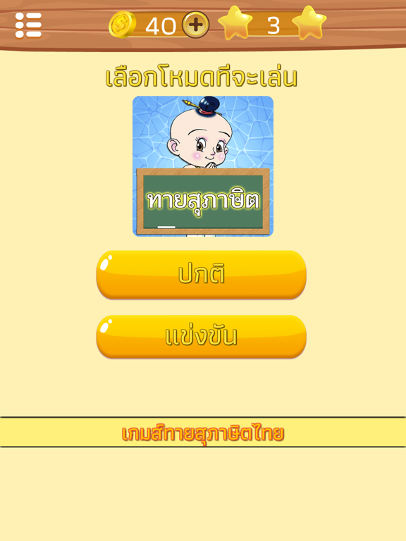 มาเล่นเกมทายสุภาษิตกันดีกว่า โดนจะมีภาพ และมีตัวเลือกให้เลือกตอบ มีตัวเลือก 4 ตัวเลือก ได้เล่นทดสอบความรู้ภาษาไทยกัน ภายในเกมทายสุภาษิต ประกอบไปด้วยหลายๆ สุภาษิต คำพังเพยมากมาย อาธิเช่น เขียนเสือให้วัวกลัว , น้ำขึ้นให้รีบตัก , มือไม่พายเอาเท้าราน้ำ เป็นต้น