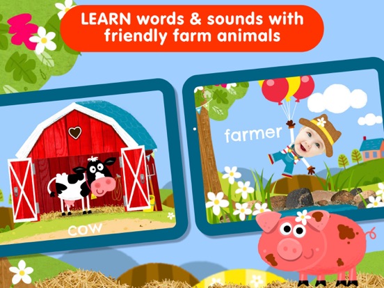 Peekaboo is the perfect first game for babies. Cute animals hide in the barn, and your baby hides too! Learning animal sounds helps your baby develop early literacy & motor skills.