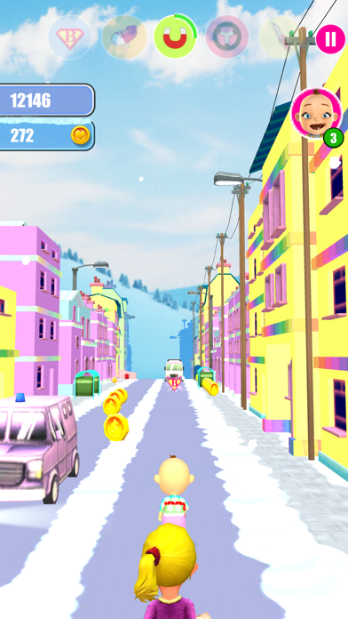 While running, avoid hitting trucks, cars, buses or any other object that could either slow you down or stop you. Collect all the fun power ups to get further and to give the tireless babysitter the slip.