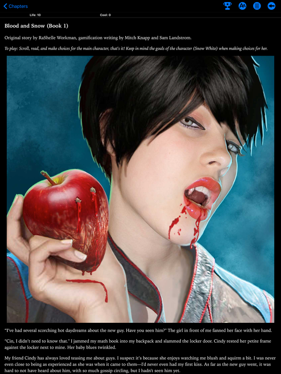Delight Games has teamed up with author RaShelle Workman to create a game version of her hit full-length novel "Blood and Snow (Book 1)". As you read the story, you make choices for the main character (Snow White). Can you survive to the end? Can you get the high score for each part? Can you unlock the nearly 50 achievements including the "Daddy Issues" and "Crushing Move" achievement?