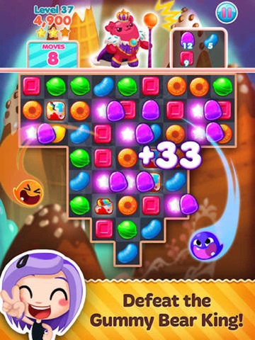 * BATTLE the tyrannical Gummy Bear King in the exciting Battle Mode. Stun the evil King with big matches before he Goops up your candies!