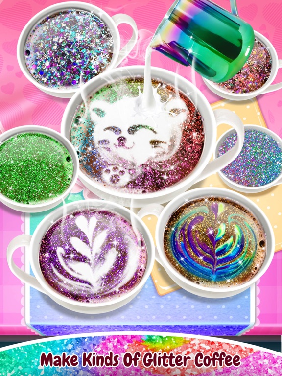 Make your own brand glitter coffee!! Create sweet coffee with various types of glitter, ice cream and espresso... You can be the most trendy glitter coffee maker right now to design and make your own a cup of glitter coffee.