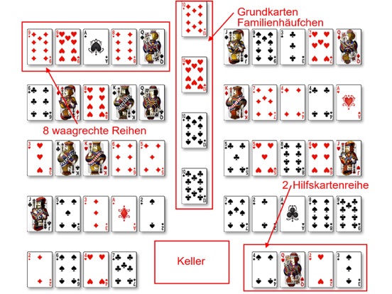 Mit einer zweiten freigespielten Reihe sind Sie noch besser dran. Aber auch jetzt müssen Sie noch genau vorausplanen, wie Sie die blockierten Reihen auflösen. Die Patience ist aufgegangen, wenn auf den Grundkarten die Familienhäufchen liegen.