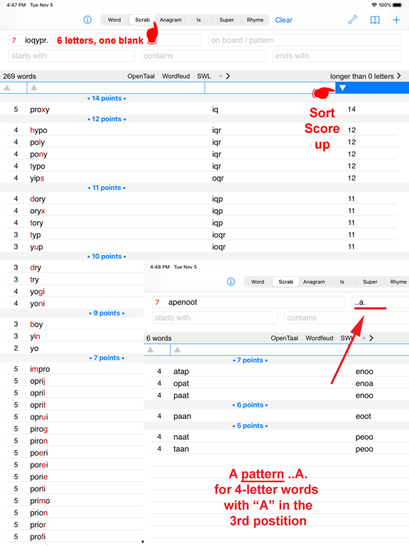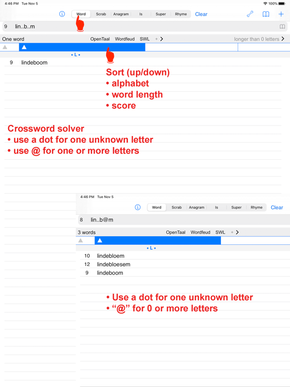 Solves crossword puzzles, cryptograms, Scrabble™, Wordfeud, 2 voor 12, rhyme, or just to check your spelling. Sort up/down by word length, alphabet or score to find not just the longest words, but the words with the highest score!