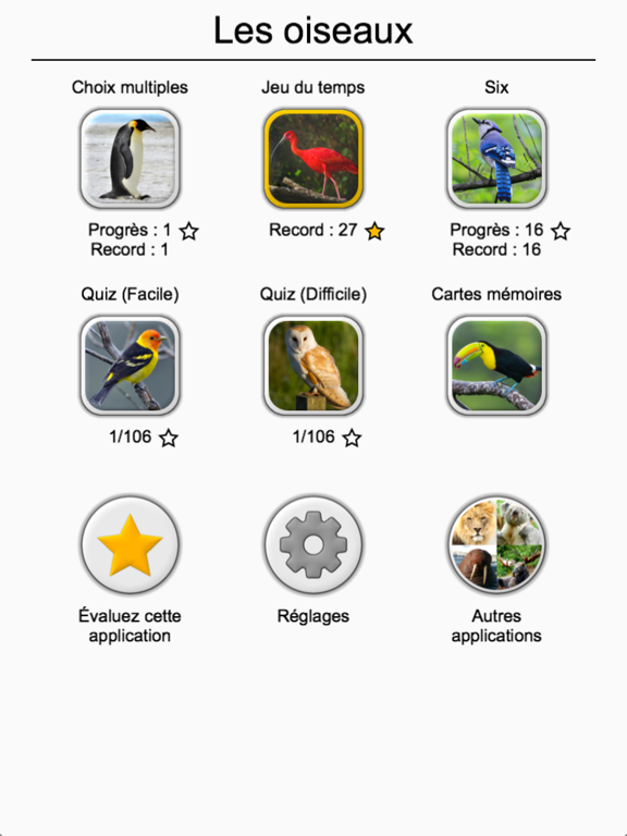 Ce jeu contient des photos de 106 oiseaux de partout dans le monde : le chardonneret européen et le condor des Andes, le perroquet gris africain et l'émeu australien, même les pingouins de l'Antarctique !