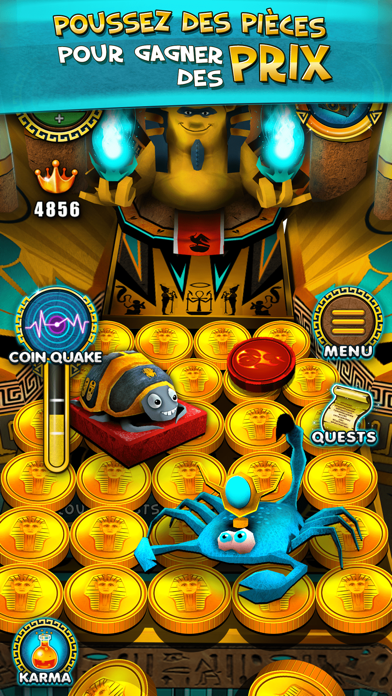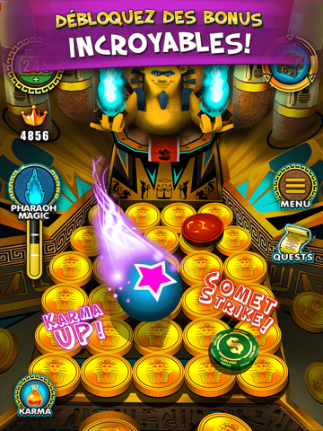 Faites tomber des pièces d'or en continu sur le plan de jeu afin de pousser des piles d'argent, de jetons et de lots vers vous, et découvrez un fantastique environnement 3D sur le thème du Casino royal et de l'ancienne Égypte. Remportez des prix et des jetons spéciaux offrant des effets de jeu aussi divers que variés. Échangez vos prix contre des pièces ou dépensez-les lors des quêtes pour débloquer les pouvoirs magiques des pharaons et autres jetons égyptiens.