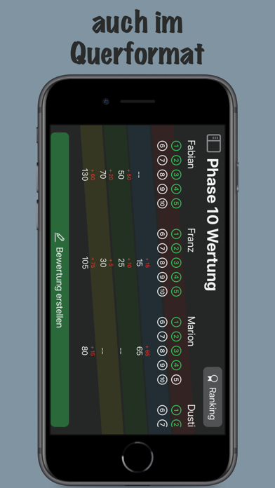 Abhilfe schafft Phase 10 Wertung. Einfach die Spieler eingeben und starten. Wurde eine Runde beendet könnt ihr nacheinander die Phasen und die übrigen Karten eingeben im Anschluss werden die Punkte automatisch addiert. Durch die abgebildeten Karten müsst ihr nicht einmal die Punkte für jede Karte wissen, eintippen genügt und die richtige Punktzahl wird hinzugefügt.