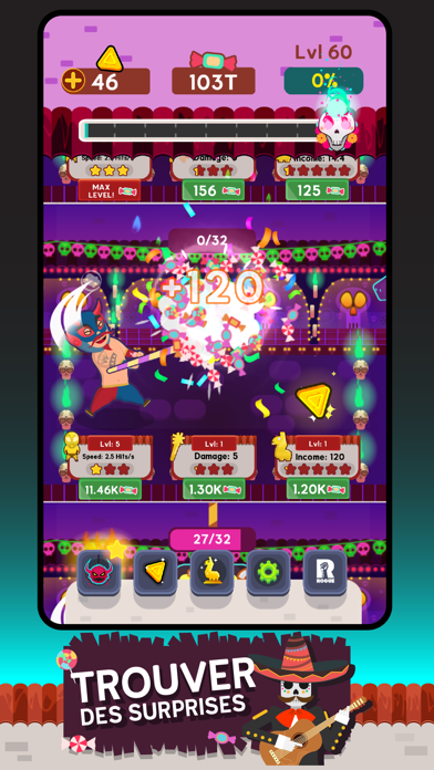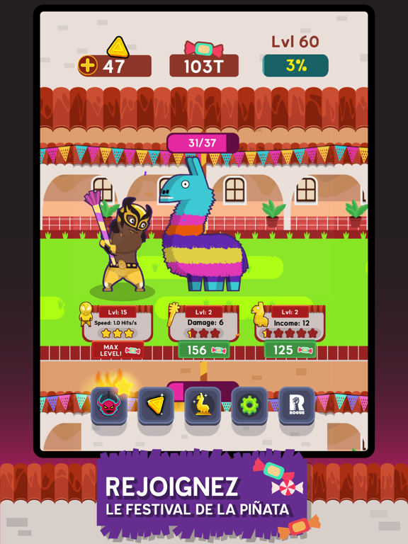 Déverrouillez des améliorations pour rendre votre carnaval encore plus divertissant. Augmentez votre vitesse de frappe, vos gains ou la quantité de sucreries que vous donnent les piñatas, entre autres.