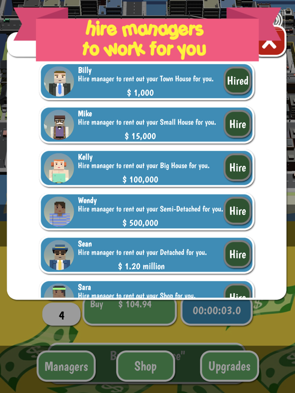Build your own business with rent out amazing property and become an idle tycoon in this cool game! Automate your workflow with hire managers and collect your income, even when you are offline!