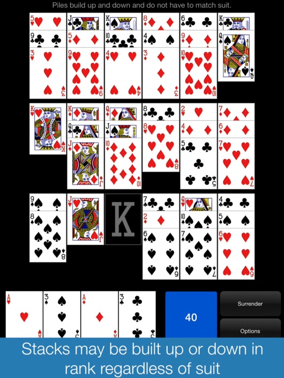 Cards may be stacked up or down by rank in any suit but the trick is that they can never be stacked more than 3 cards high.