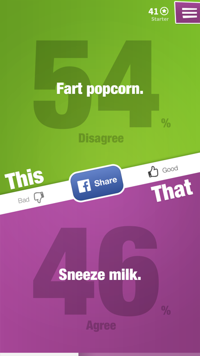 This or That, a spin-off of "What if..", is a question game where you either answer "This" or "That" to casual, personal, challenging and crazy questions and immediately see how other players answered! Perfect for parties as well as for just passing time. You have nothing to lose, try it out!