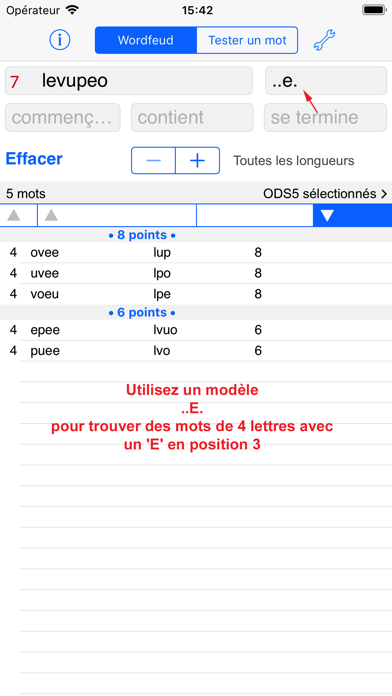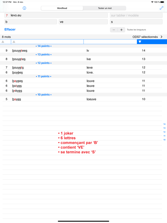 Nouveau est le "mot Test" l'option: test si un mot existe, et trouver des mots avec les lettres manquantes. Vous pouvez l'utiliser pour voir si il ya des mots qui pourraient convenir à une situation de jeu, et les lettres dont vous auriez besoin. Aussi pratique pour trouver des combinaisons de 2 lettres. Utilisez un seul point pour une lettre manquante, le signe @ pour plus d'. Également utilisable pour les mots croisés.