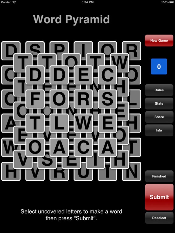 Starting with a pyramid of letters make the best words you can. After scoring a word the letters are removed from the pyramid revealing the letters underneath.
