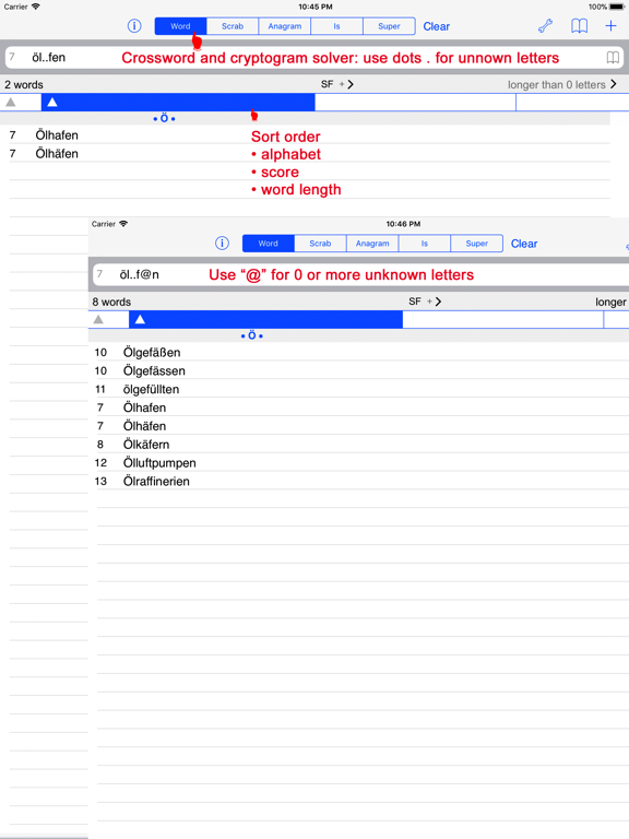 Slide Over: you can now use the Wordsfinder in front of another app, for example in front of Wordfeud, or a puzzle app! It requires iOS 13, and is only available on iPad.