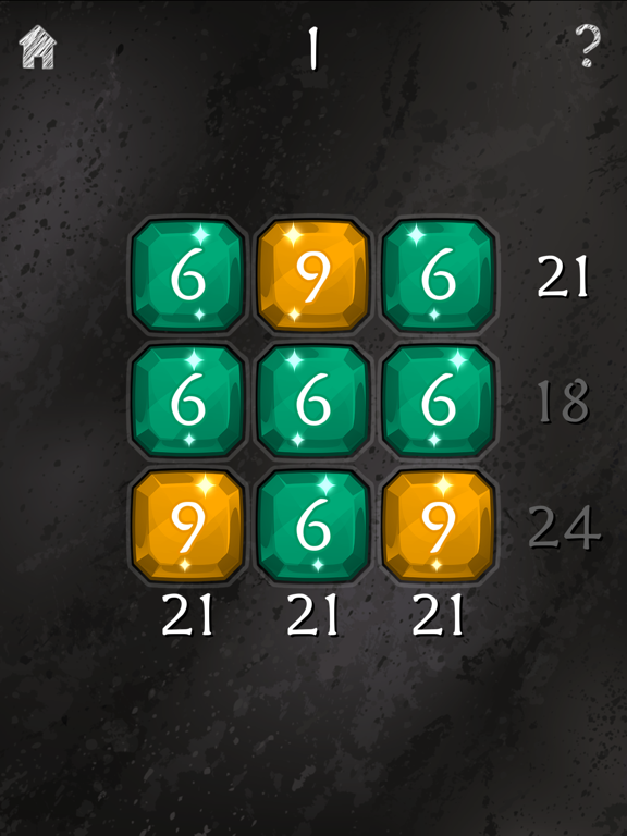 XXI puzzles require a sum of 21 in every row and column. Move the gems around on the board until a solution is found. All gems have a unique numerical value, but watch out for the special gem that can be either a 1 or 11. Puzzles get harder as you progress your way through all 200 levels. Can you become a XXI champion?