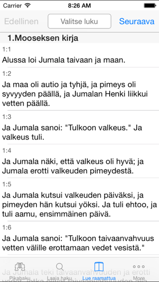 - Mahdollisuus lukea eri käännöksiä (Kirkkoraamattu 1938, Biblia 1776, Ruotsi 1917 ja KJV 1789). Valitse käytettävä käännös: Muut > Asetukset