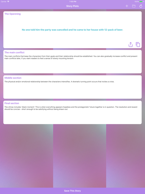 There is also a section where you can submit your own creative plots and stories ideas! Access it from main screen by pressing '+' icon. Or save any story you like to customize it later!