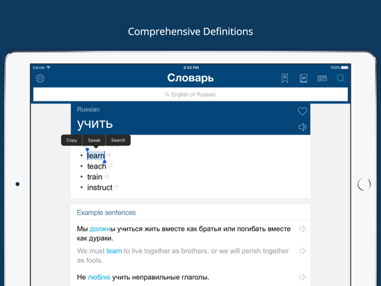 The Russian English Dictionary & Translator app enables you to search Russian & English words with definitions, examples, pronunciation, and more.