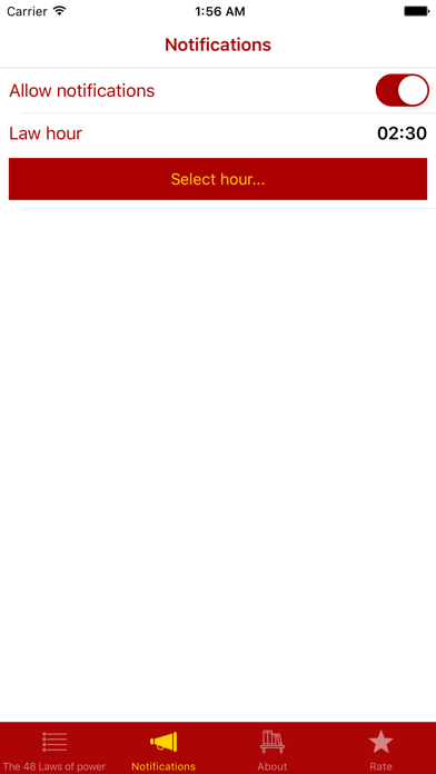 In the second section you can manage the appearance of a daily notification with the title of the current law. Once you allow notifications, from the day that enabled them in the following 48 days you will see a different law, every day. Tapping in the notification, you can access the app and view its description.