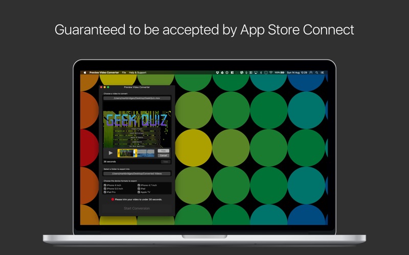 App Preview Converter also validates your video for you to prevent failed uploads due to requirements such as length. Should your video not meet Apple's length requirements, you can even trim the video without leaving the app.