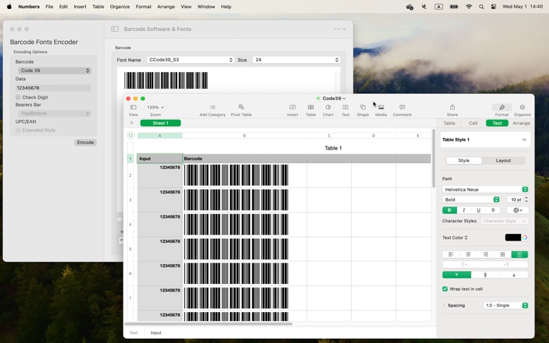 1. Create barcodes using fonts and embed them in documents such as Apple iWorks, Apple Pages, Microsoft Excel, Microsoft Word, Adobe PDF, Adobe Photoshop, and Adobe Illustrator.