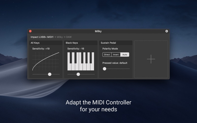 Milky is a tiny MIDI effect processor app that sits between a MIDI Controller and DAW software or another MIDI receiver. It can adjust keyboard sensitivity, invert the sustain pedal polarity, route messages to different channels, and more.