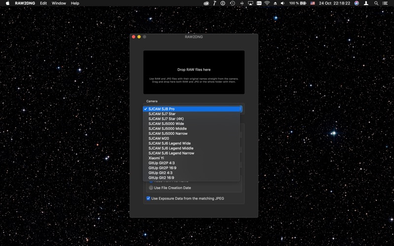Input options: drag and drop folder with RAW files or individual RAW files to the application or to its icon. Use RAW files with its original file names from the camera as they could be used to get date and time of each image. Usually your camera will put JPEG file along with each corresponding RAW - they could be used for exposure and GPS information (if available). Notice: RAW2DNG will not has access to that JPEGs until you drag and drop them too in to the app, so it is usually simpler to drag and drop the whole folder with RAWs and JPEGs.