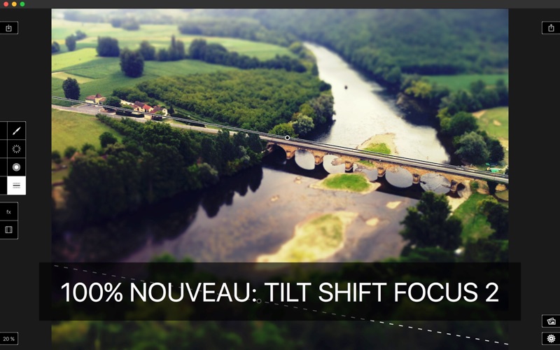 Avec Tilt-Shift-Focus, vous pouvez facilement éditer des photos pour créer de fausses miniatures, améliorer ou modifier la profondeur de champ et la zone de focus de votre image, ou atténuer les détails. La fausse miniature et la profondeur de champ peuvent améliorer la qualité visuelle et artistique de vos photographies et vous pouvez faire tout cela en quelques clics dans l'éditeur Tilt-Shift-Focus.