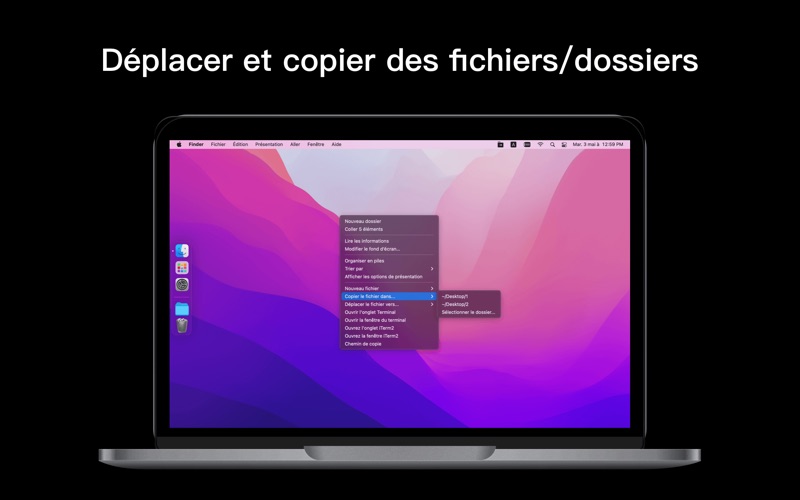 ToMenu est une extension de Finder hautement configurable qui ajoute des actions puissantes au menu contextuel et à la barre d'outils du Finder - cela permet de faire rapidement et facilement des choses telles que déplacer et copier des fichiers, créer de nouveaux documents et bien plus encore. L'application est livrée avec plusieurs actions prédéfinies utiles.