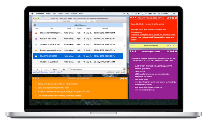 JustNoteIt is a simple, effective and reliable app that lets you keep your thoughts organized and concentrate on new ideas. Create, color code, format, show, hide, arrange, resize, lock, search, share, print, and duplicate notes with a single click.