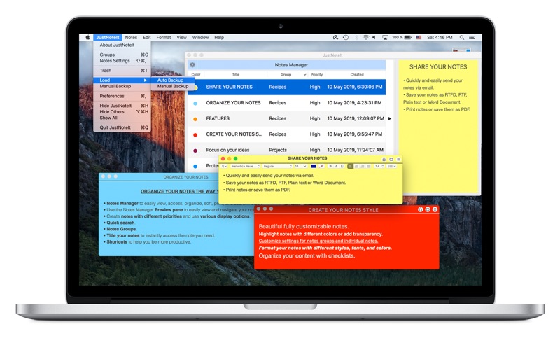 • Backup: JustNoteIt lets you backup and load your notes database with a single click.
