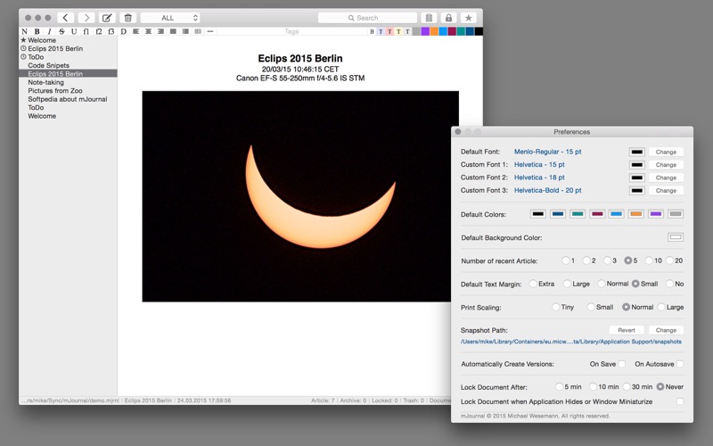 mJournal is a note taking application for Mac OS X with an unique usage experience and a focus on simplicity, security and syncing.