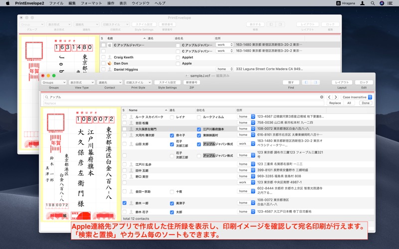 PrintEnvelopLite2との違いは、Apple連絡先に保存されたデータを直接表示し、宛名印刷や住所の編集が行えることです。