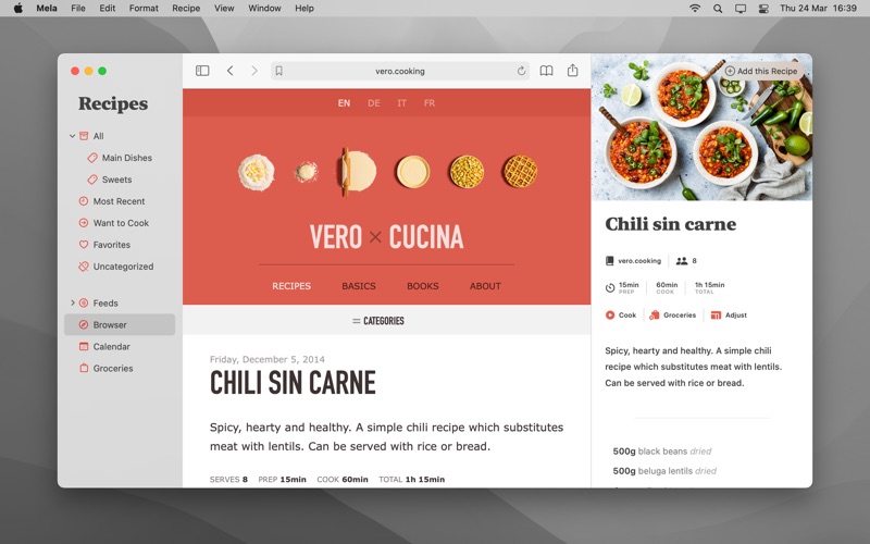 Quickly save a recipe while browsing: If Mela detects a recipe on the currently viewed page, it will be displayed in Mela's native recipe viewer*, on the same screen. Want to add or view a recipe from outside of Mela? No problem, just use Mela's sharing extension.