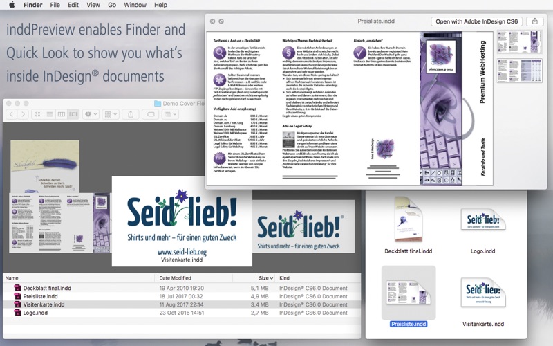 inddPreview comes with a Quick Look plug-in on board, that enables Finder to show preview images of InDesign® documents* without the need to open them with InDesign®.