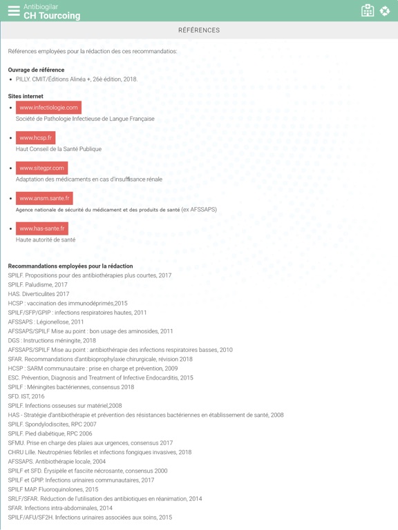 A la mise en ligne d’Antibiogilar en février 2019, seul le Centre Hospitalier de Tourcoing a publié ses recommandations. Les propositions tiennent compte de l'écologie bactérienne de l'année précédente au Centre Hospitalier de Tourcoing.