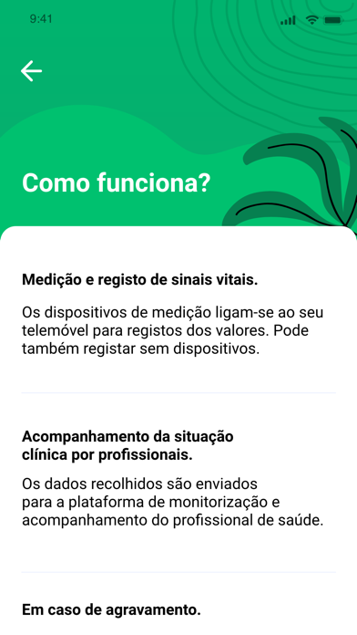 Aplicação móvel que permite aos utentes do Serviço Nacional de Saúde, que se encontram em programas de Telemonitorização, registarem as medições de parâmetros biométricos e autoavaliações que contribuam para a melhor gestão do seu problema de saúde e o acompanhamento à distância por profissionais de saúde.