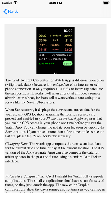 Civil Twilight for Watch finds your location, and calculates the sun position without going out on the internet like the other apps. Anywhere in the world! In your plane, on your boat, out on a hike! This is self-contained on the Watch and doesn't need the phone nearby either! Accurate to about a minute through the year 2050. For many more features, including sun rise and set times for other dates and places, check out our iOS app "Civil Twilight Calculator" on the App Store.