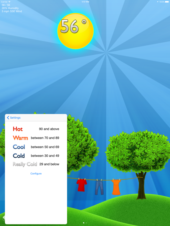 Everyone experiences temperatures differently based on geography and body functioning. iDress for Weather takes this into account by allowing you to define what is hot, warm, cool, cold, and really cold.