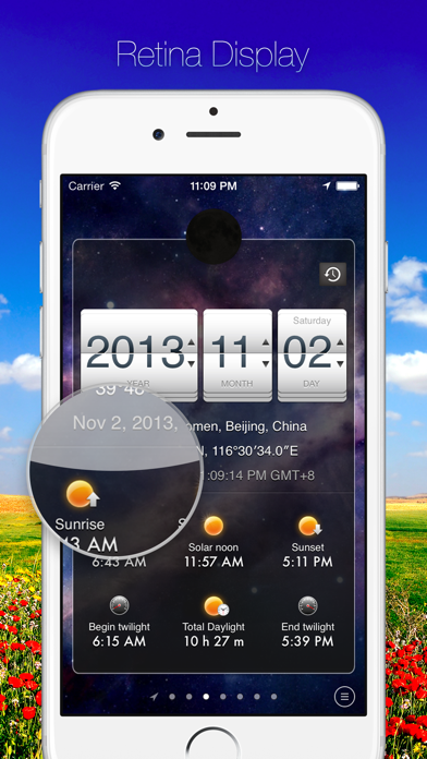Lever et coucher du soleil HD est un très puissant, très facile à utiliser pour le calcul pour toute date : le lever et le coucher du soleil, la durée d’ensoleillement, l’heure à midi, à l’aube, l’information en temps crépuscule. Il peut non seulement calculer le temps de la journée, mais il peut également calculé n’importe où dans le passé ou dans le future.