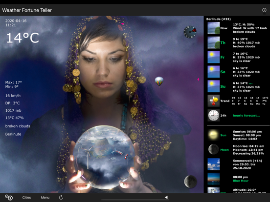 This fortune teller tells you ahead of the weather. Big Temperature display, windchill temperature, humidity, wind speed, wind direction, barometer, moonphases and more values can hardly be desired. With this weather fortune teller you can have fun with the weather. A 4-days weather forecast and more is built-in.