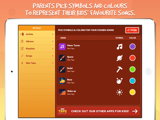 A symbol and colour based music player created especially for young kids. Do your kids find it tough to navigate through the default music app on the iPad? Rather than navigating through a text-based music library, kids can easily identify their favourite songs via a recognisable colour and symbol set by their parents, so even the youngest kids can play with these 3 themed players.
