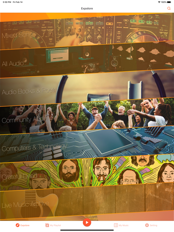 Discover and download thousands of royalty-free tracks from open audio libraries. Filter by category — Mixed Songs, Audio Books, Poetry, and Community Audio — and build your own playlists.