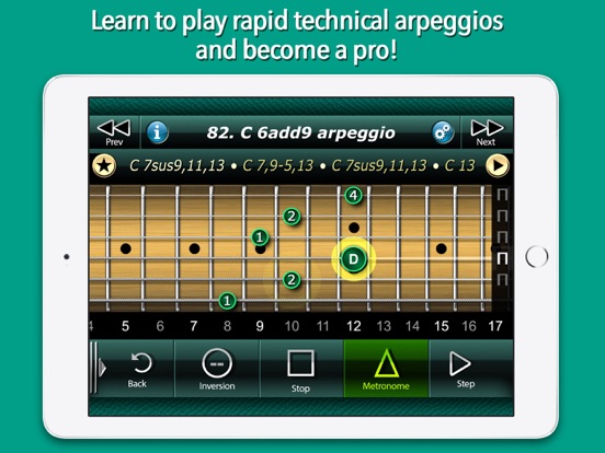 ● Every arpeggio is provided with corresponding optimal fingering and a sequence of strokes, showing you necessary strokes for every note of arpeggio. These strokes (upstroke, downstroke, pull-off, hammer on, slide and tap) are provided to help you to achieve high speed arpeggios playing. Read the info page inside this application for detailed description on every stroke.